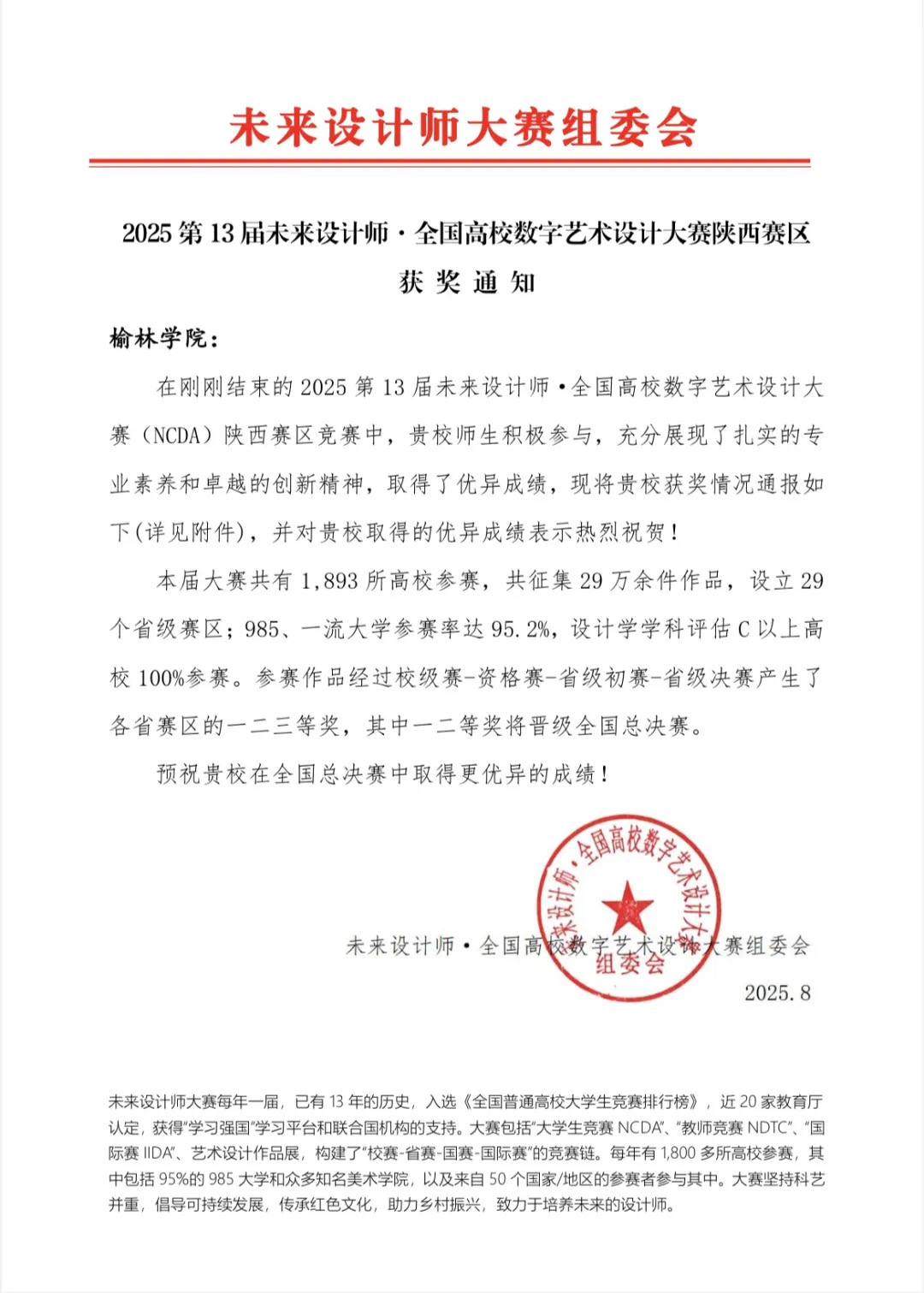 本届大赛为全国普通高校大学生竞赛排行榜内赛事,获近20家教育厅认定及“学习强国”、联合国机构支持,构建“校赛-省赛-国赛-国际赛”完整竞赛链,吸引1893所高校、29万件作品参赛(985/一流大学参赛率95.2%,设计学C+以上高校全参与),经层层选拔评定省级奖项,一、二等奖晋级全国总决赛。