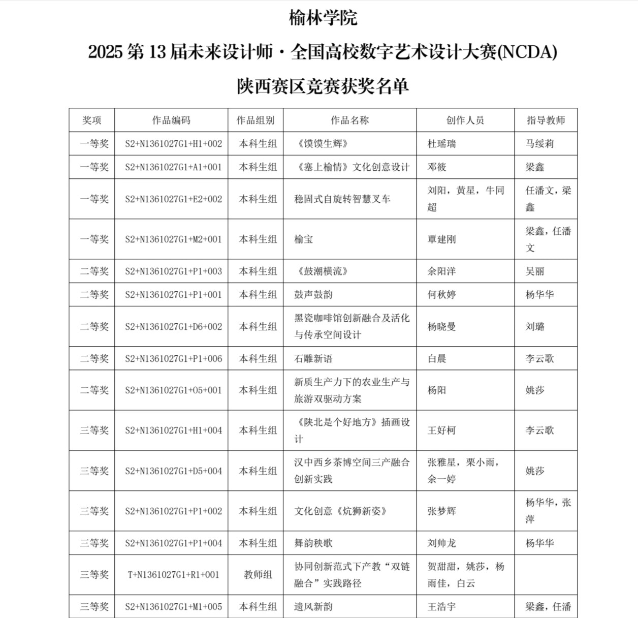 2025年第13届未来设计师·全国高校数字艺术设计大赛(NCDA)陕西赛区结果公布,榆林学院艺术学院师生凭借专业实力与创新表现斩获佳绩:本科生组获4项一等奖、5项二等奖、6项三等奖,教师组获1项三等奖。获奖作品涵盖文化创意与数字设计、空间设计、智慧产品设计等领域,既融合陕北地域文化特色,又体现艺术与科技、传统与创新的结合。