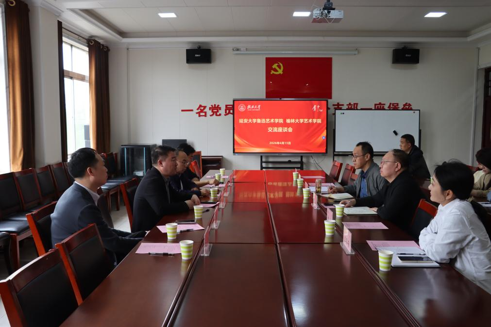 为深入传承红色基因,加强校际艺术教育交流合作,推动艺术学科建设、党建工作与人才培养协同发展,2026年4月15日下午,延安大学鲁迅艺术学院党委书记董振文、院长李延俊、党委副书记李涛、副院长李辉、兰庆炜、邵瑞等一行莅临榆林大学艺术学院开展交流座谈活动。榆林大学艺术学院领导班子、各教研室主任及科级以上干部参加此次座谈,双方围绕党建引领、专业建设、科研合作、人才培养等核心内容深入交流、共话发展。